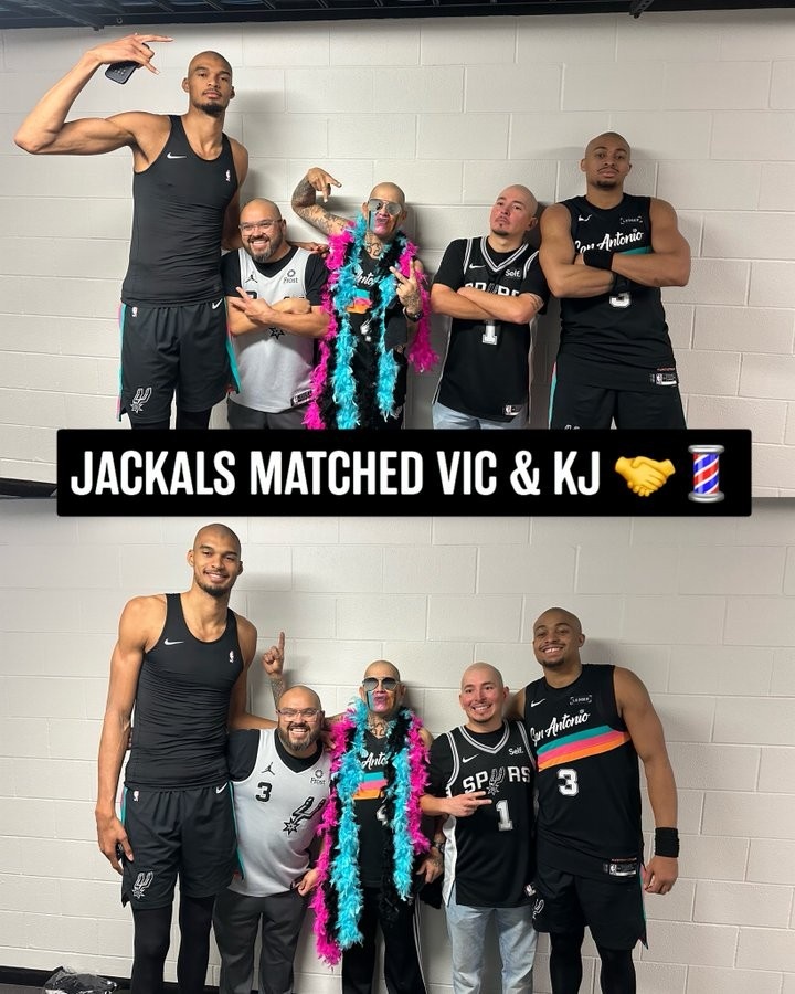 马刺主场大胜雄鹿,赛后,文班亚马和凯尔登·约翰逊与主场球迷团三位光头球迷合影,马刺官推写道:“看来光头造型正在流行~”